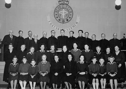 Gruppbild med Frälsningsarmén i Gränna. Tre rader, sittande och stående; kvinnor, män och barn. Flertalet i uniform.