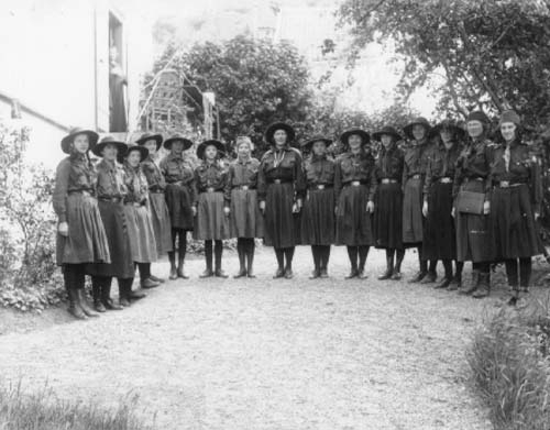 Gruppbild med 15 kvinnliga scouter uppställda i en halvcirkel på en gårdsuppfart. En kvinna står vid en dörr en trappa upp till vänster.