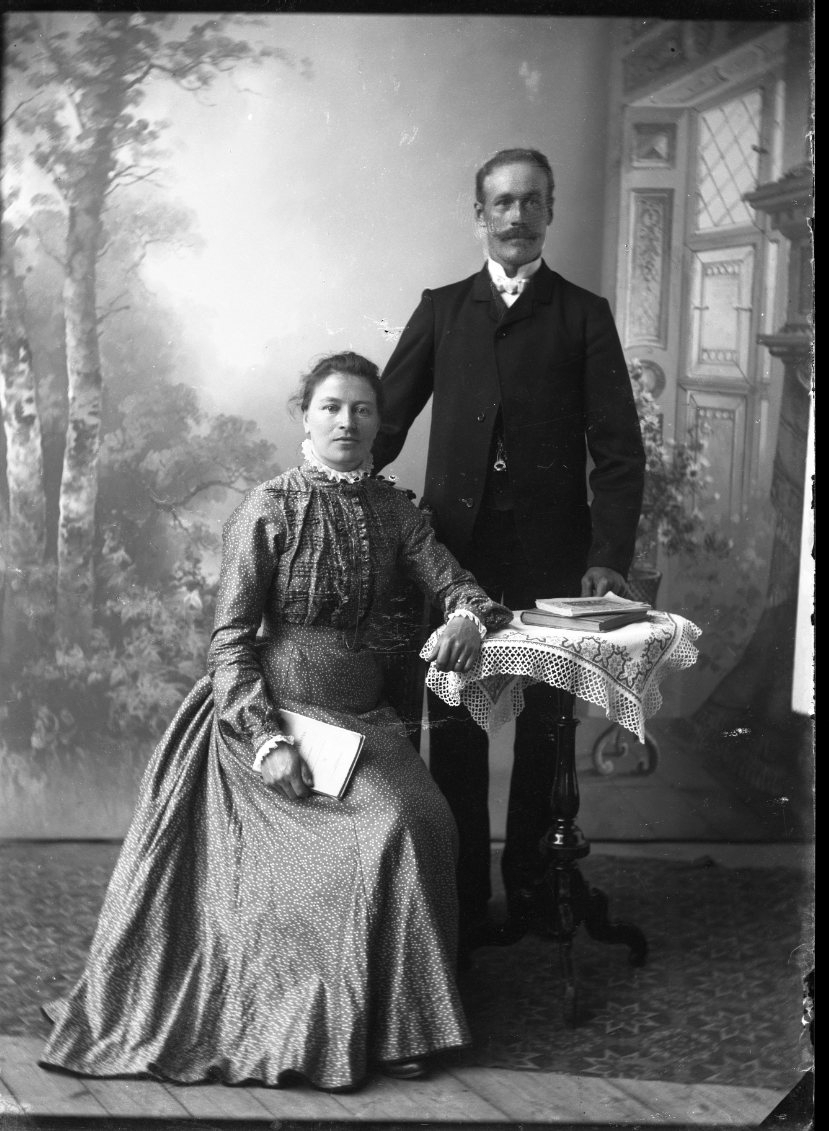 Gruppbild med man och en kvinna. Kvinnan sitter vid ett pelarbord med ett spetsduk, det ligger böcker på bordet och hon håller en i sin hand. Mannen står bakom henne med höger hand på ryggstödet.