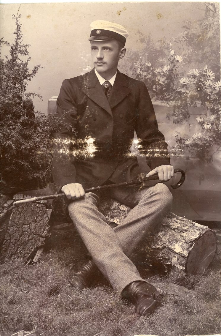 Fotografi av en okänd ung man med studentmössa och spatserkäpp. Han sitter i skoglig miljö i en ateljé.