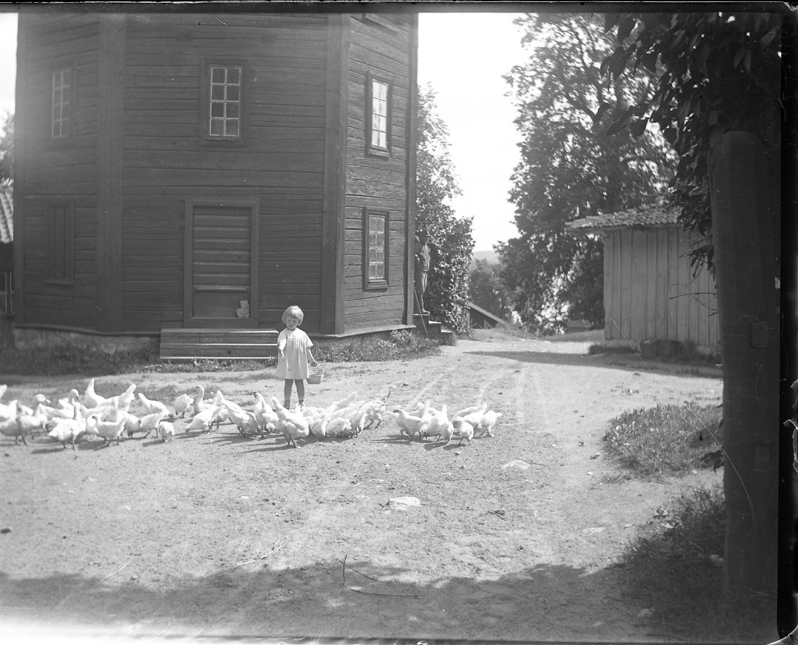 Ett barn matar höns på en grusplan framför en magasinsbyggnad, möjligen oktagon sådan. Troligen "gossen Falkenberg".