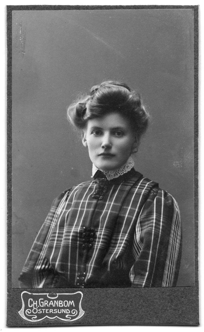 Kabinettsfotografi: en ung kvinna i rutig klänning e motsv.