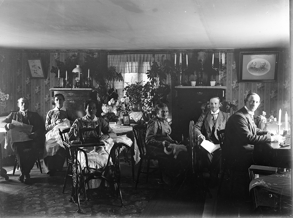 Interiör från ett hem med lågt i tak. Till vänster vid ett fönster sitter en man vid ett bord med en tidning i händerna. Till höger vid ett fönster sitter en man vid ett skrivbord med ljus på bordet, han vänder sig mot fotografen. Till vänster om honom sitter en man några papper i knät. Mellan männen sitter från en vänster en kvinna med sömnad i knät, en annan vid en symaskin och en tredje äldre kvinna vid en spinnrock.