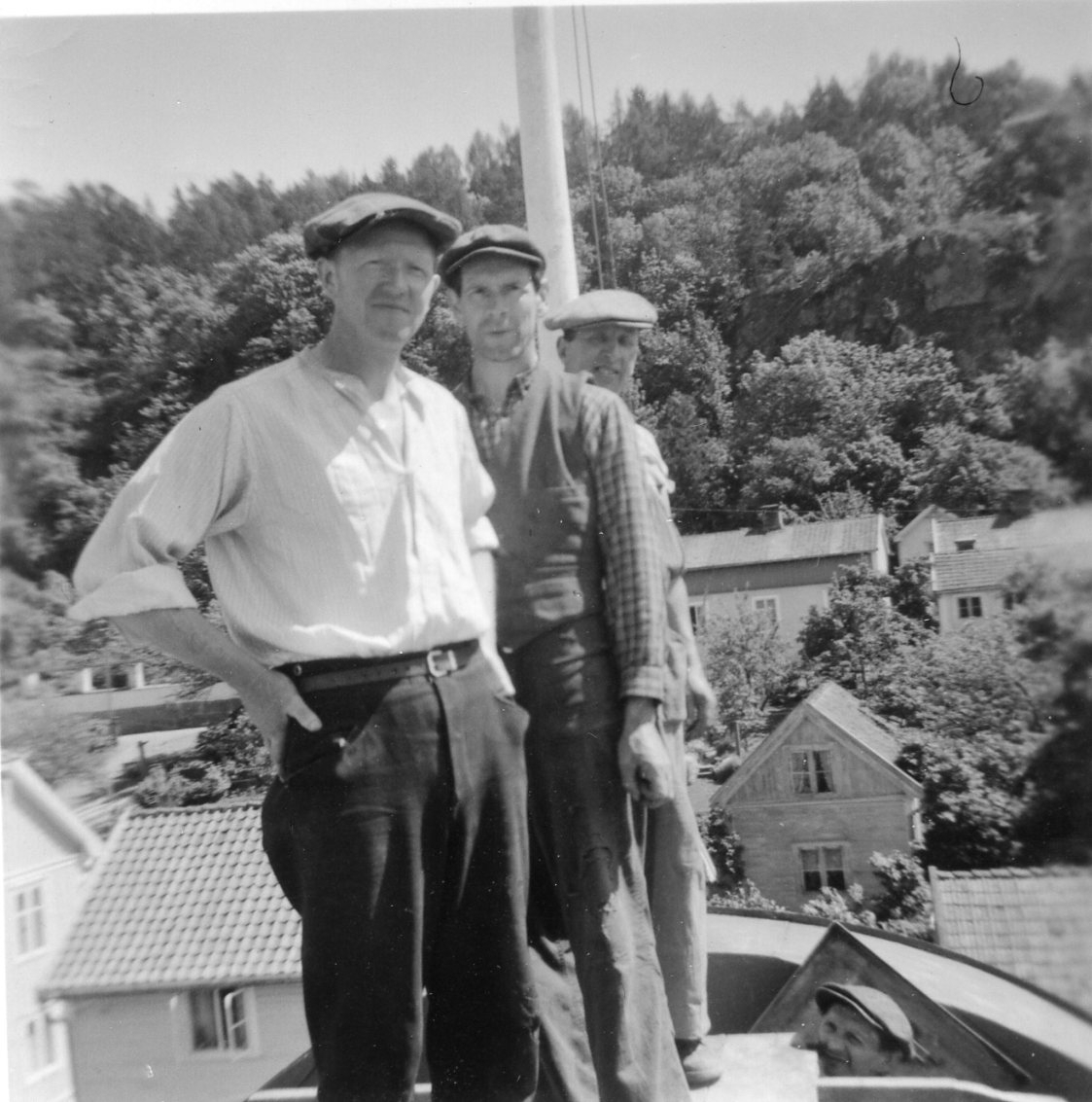 Tre män med keps står på taket till Brahegatan 3. En fjärde oidentifierad man tittar upp genom takstolen. Det är sommar.