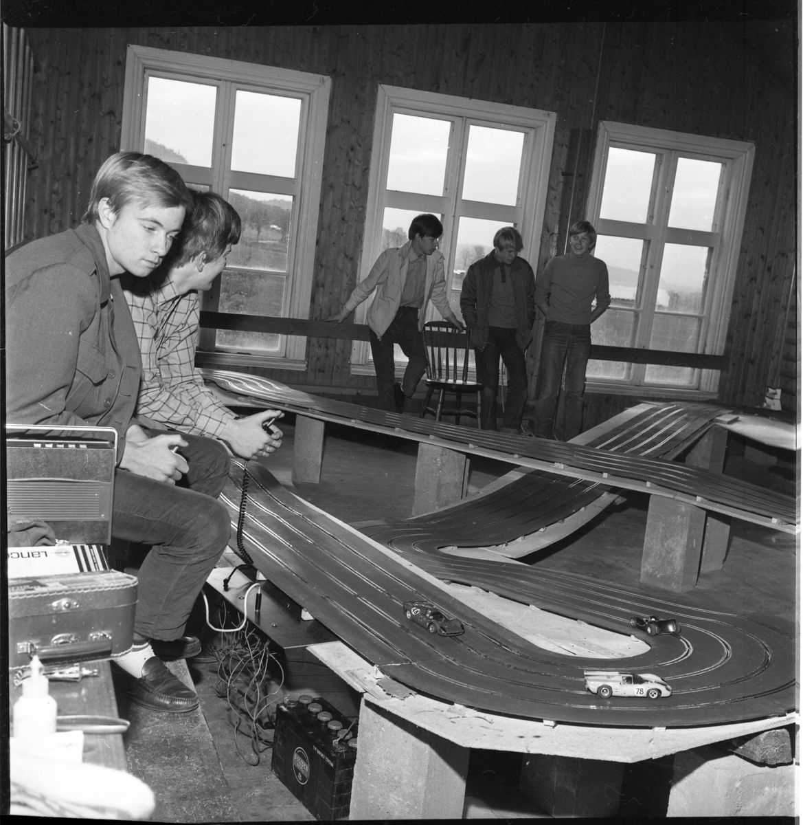 Två killar sitter och kör med en stor miniracingbana står uppställd på typ polsten. I bakgrunden vid fönster med 6 lufter står tre killar och tittar på. Från vänster: Svante Landström, Lars Rosenqvist, Sten Forsén, Thomas Johansson samt Carl-Gustaf Tollén.