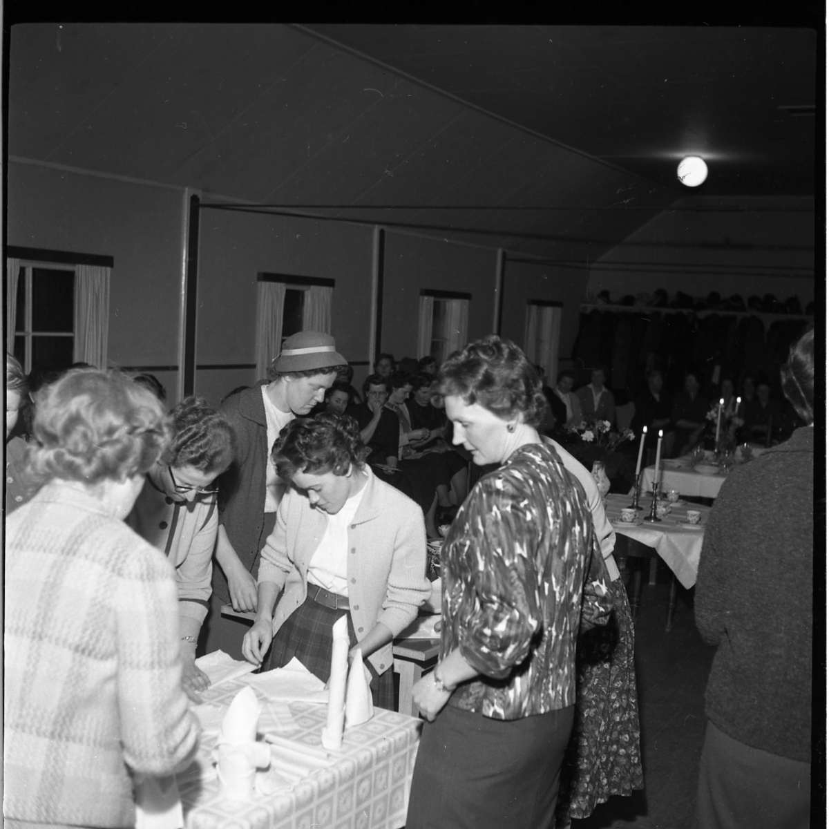Några kvinnor står runt ett bord och viker servetter. I bakgrunden syns en pubik. Mitt i rummet står två bord dukade för fika.