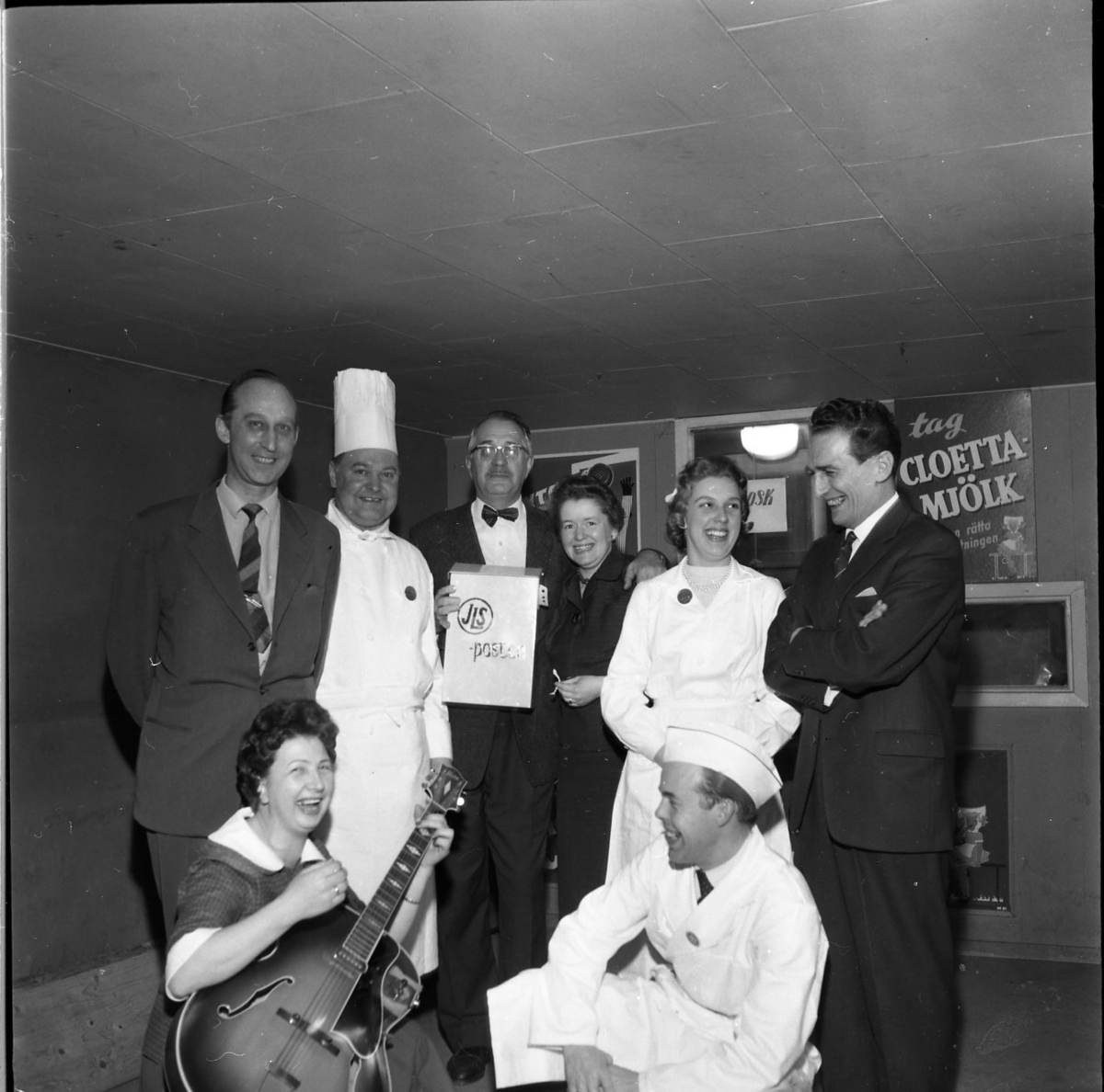 En grupp människor står uppställda för fotografering. Vissa bär kavajer, andra bär serveringskläder och kockmössor. En kvinna håller i en gitarr. En man håller i en brevlåda med texten "JLS posten" på. JLS står för Jönköpings läns slakteriförening.
