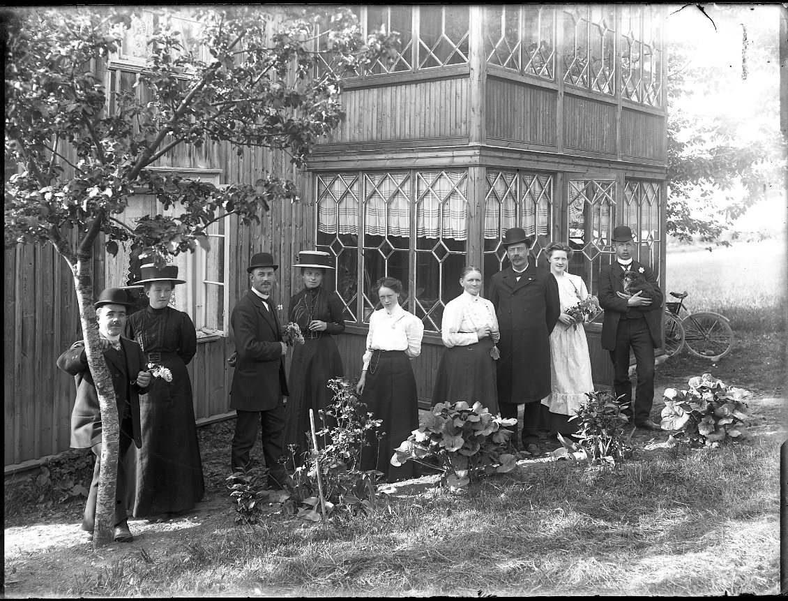 Nio kvinnor och män en inglasad veranda i två våningar med snickarglädje.