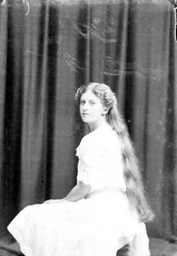 Porträtt av en sittande flicka med långt hår i en ljus klänning.