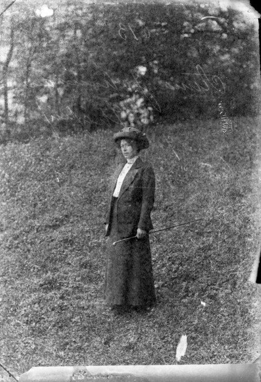 Porträtt av en kvinna som står på en gräsmatta. Hon står lite i profil och håller en käpp i vänster hand.