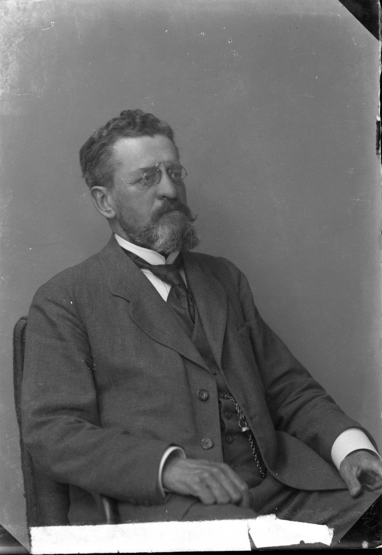 En man med glasögon och skägg sitter i en stol.