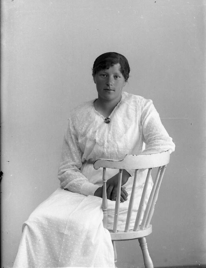 Greta Ståhl i ljus klänning sittande bakåtvänd på en stol.
