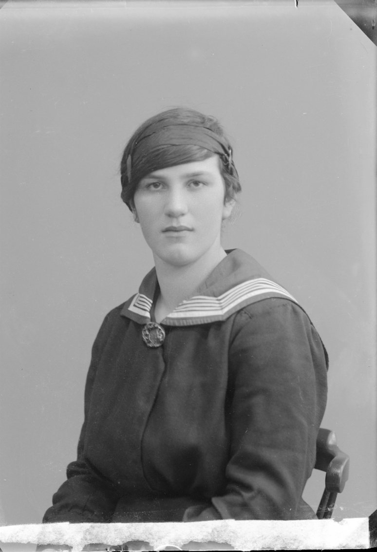 Bröstbild av en ung sittande kvinna, mörk klänning med sjömanskrage. Håret uppsatt med fläta, pannband.