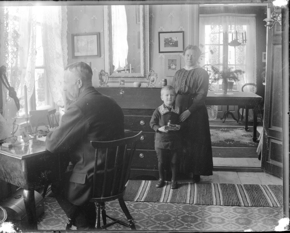En man sitter vid ett skrivbord framför ett fönster. Mot en vägg står en chiffonjé. Intill densamma står en kvinna med en liten pojke intill sig. Pojken håller en leksaksmotorcykel i händerna.