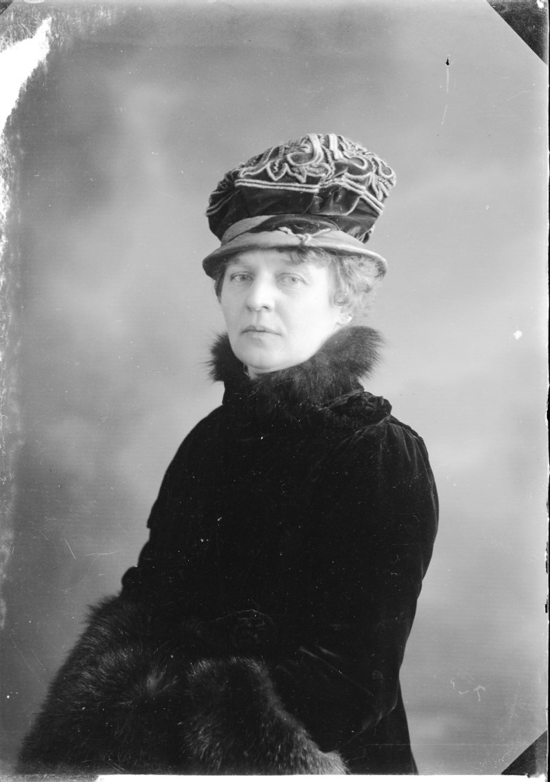 Bröstbild av en kvinna i mörka ytterkläder, boa och hatt.
