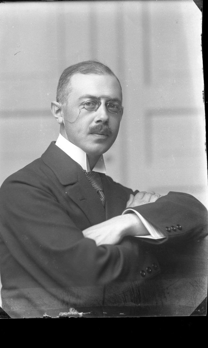 Porträtt av en man med liten mustasch, slips och glasögon. Han sitter med armarna i kors.