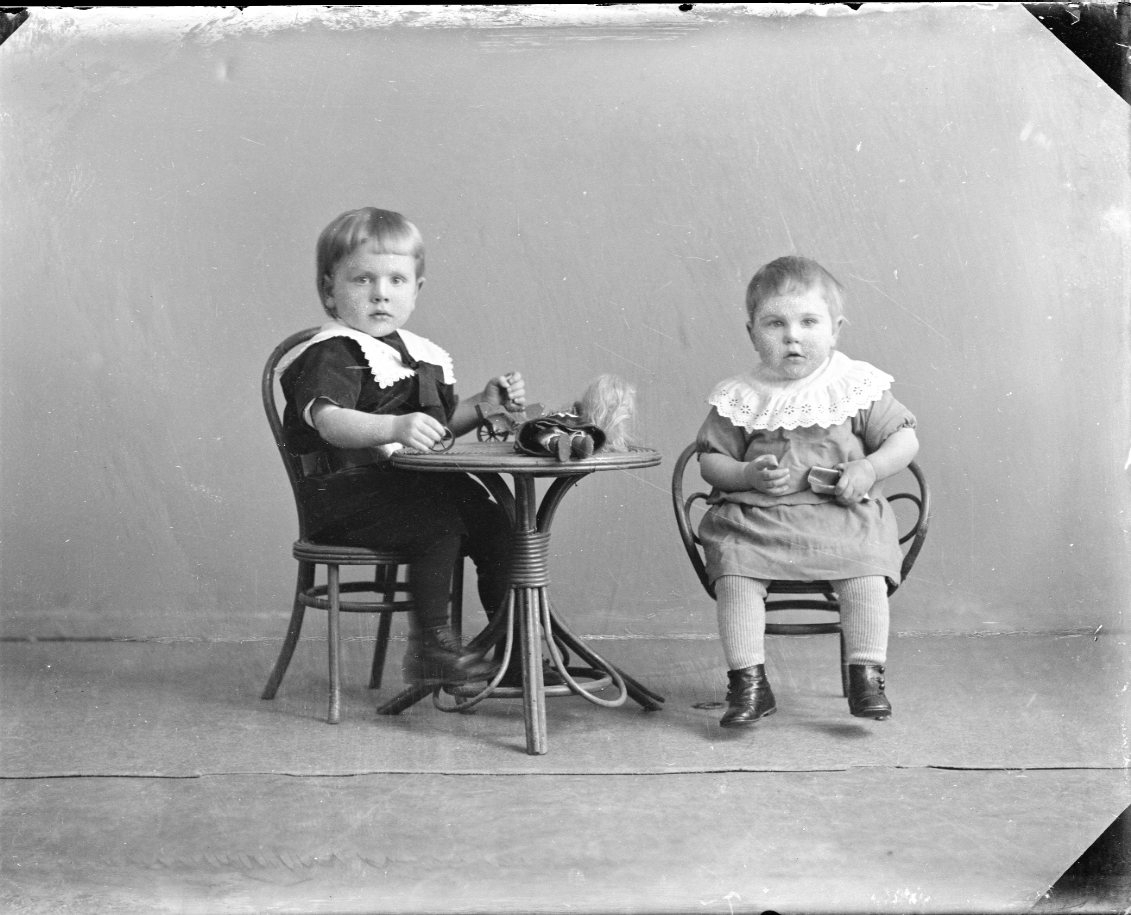 Två små syskon sitter vid en barnmöbel med leksaker, bland annat en docka.
