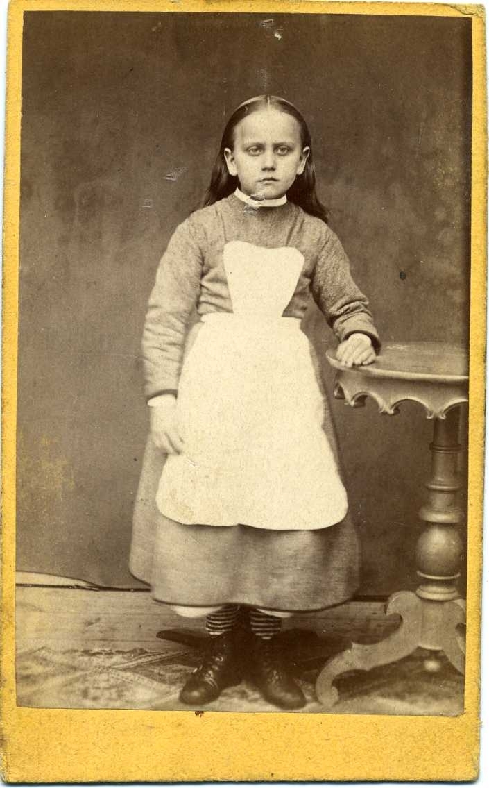 Kabinettsfotografi av en liten flicka i klänning med förkläde, hon står vid ett runt pelarbord.