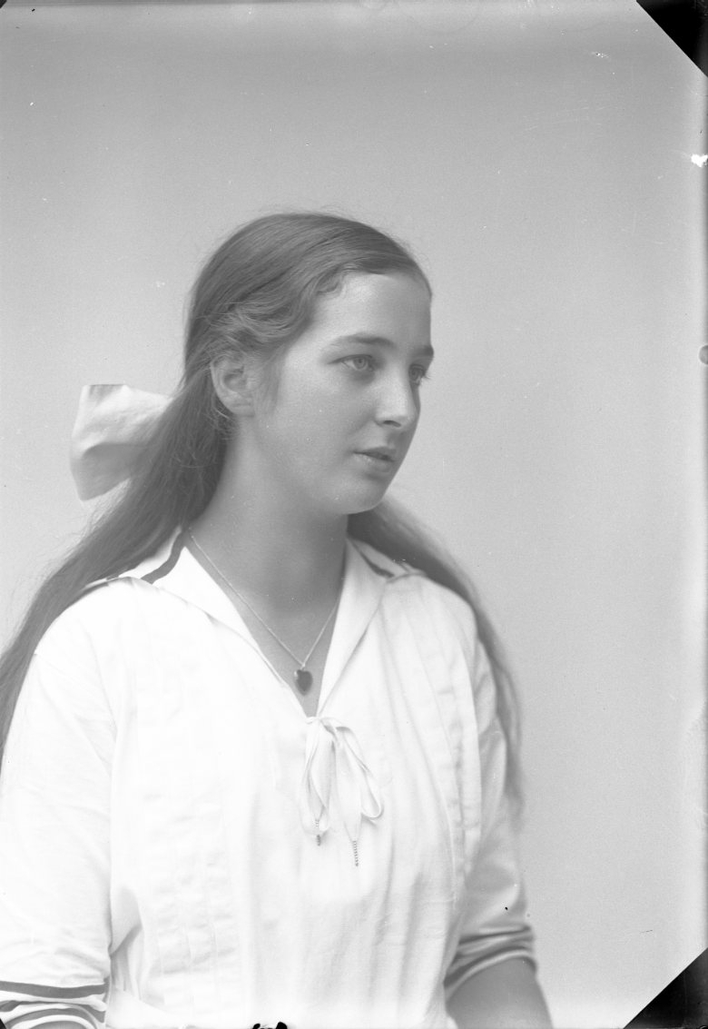 Porträtt - 3/4-profil - en flicka i tonåren, med rosett i mörkt långt hår.