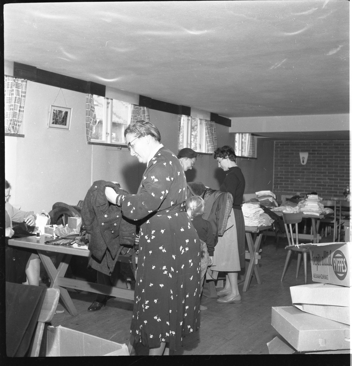 Klädinsamling i Missionskyrkan i Gränna. Okända pesoner som hanterar kläder.