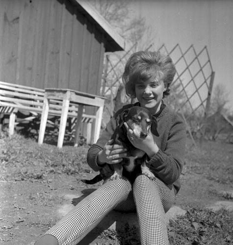 En kvinna sitter på marken, hon håller en hund i famnen. Hon har tuperat hår och och stickad tröja.