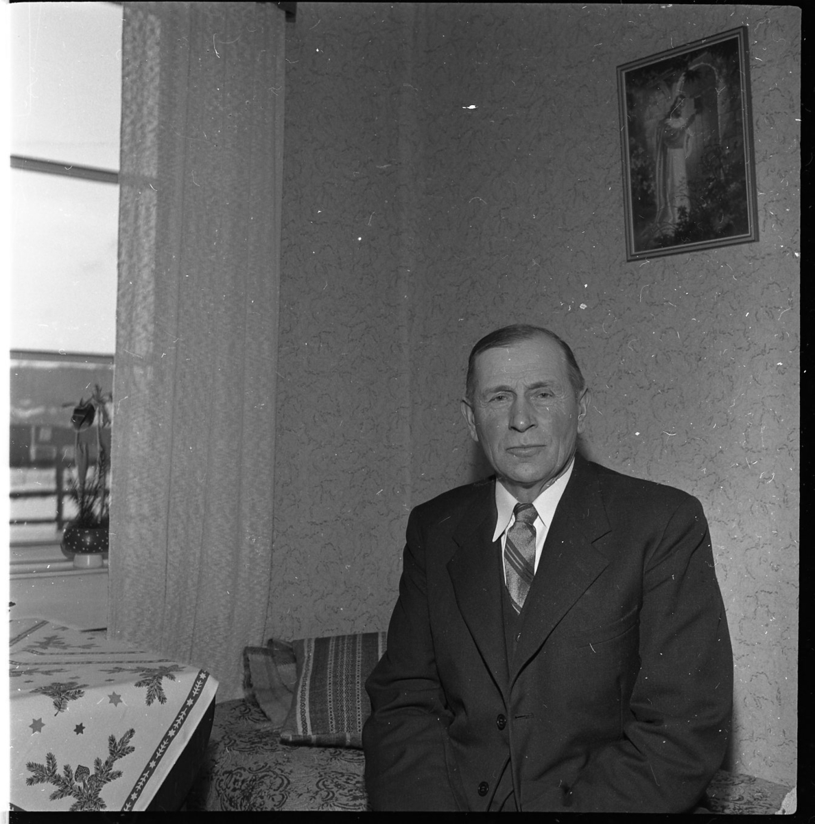 Titel: En herre sitter på en säng och tittar in i kamerna. Han bär kavaj och slips. Han sitter omgiven av kuddar och håller händerna i knät. På väggen bakom honom hänger en tavla på Jesus.