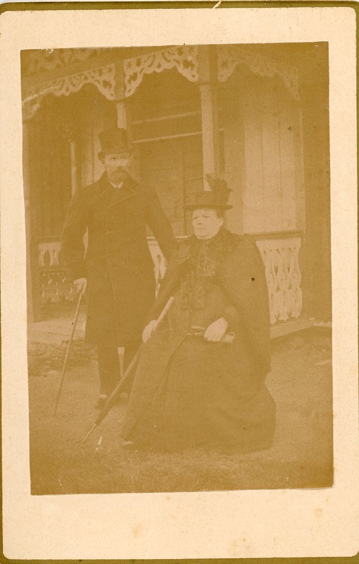 Ett äldre par framför en farstukvist. Mannen står intill kvinnan som sitter på en stol. Mannen har en käpp i handen och kvinnan ett hopfällt parasoll.