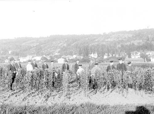 Två äldre män och en grupp ungdomar bland trädplantor på ett gärde mellan Gränna stad och Vättern. De äldre männen är Carl August Johansson och Sven Landström.