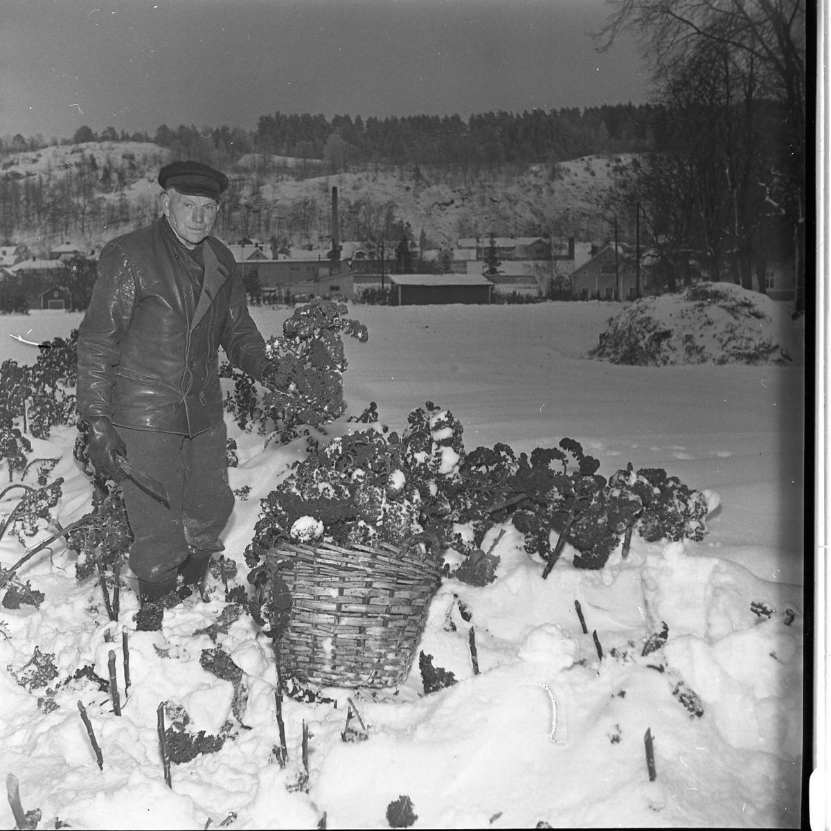 En man står och plockar kål och lägger en stor korg. Han tittar in i kameran. Fältet han står i är täckt med snö.