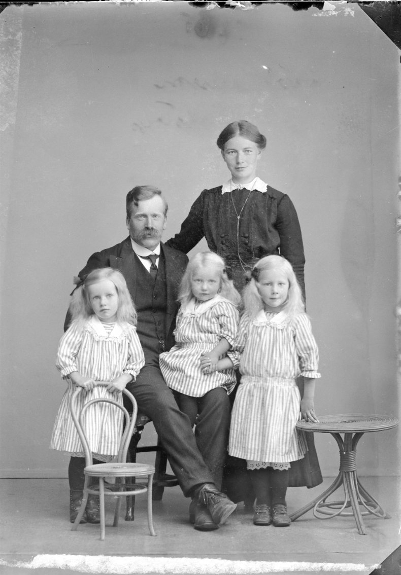 En man, en kvinna och tre små flickor i randiga klänningar. Kvinnan står intill mannen som sitter på en stol.