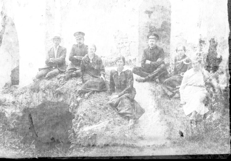 Fyra kvinnor och tre män sitter på ett valv i Visingsborgs slottsruin. Två av männen bär Frälsningsarméns uniform.