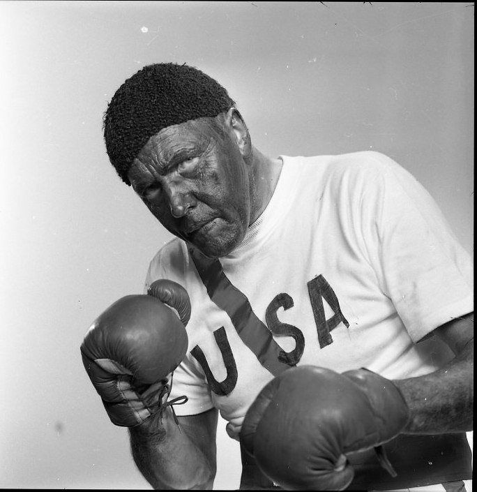 En man med mörkt sminkat ansikte, svart peruk, boxarhandskar och en t-shirt märkt "USA". Han agerar boxaren Floyd Patterson.
