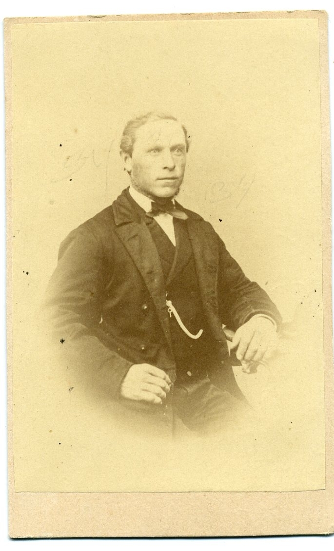 Kabinettsfotografi: porträtt av okänd man. Han sitter vid ett bord och vilar vänster arm på bordet. En klockkedja i västen.