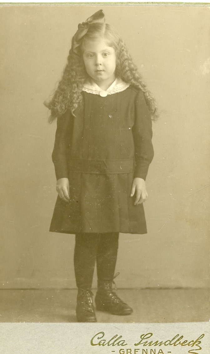 Kabinettsfotografi: en okänd liten flicka i mörk klänning med ljus spetskrage. Flickan har också en mörk rosett i det lockade håret.