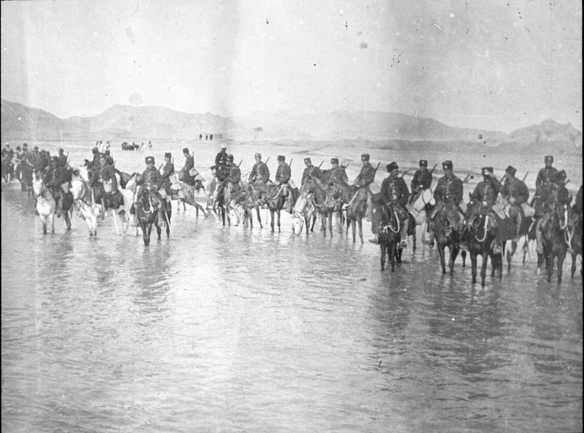 "Gendarmer till häst". "Från Chiraz-expeditionen [Shiraz] i mars 1913" - kanske det ska vara 1912? Samling vid ett vattendrag.