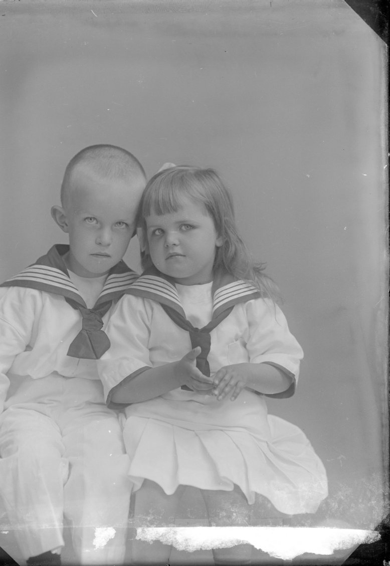 En liten flicka och pojke i sjömanskostymer.