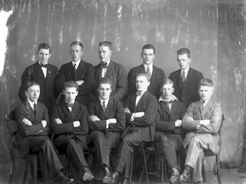 Sannolikt en grupp med beväringar. I bakre rad fr v står Erik Wadskog på Kullen, Sven Jansson i Björstorp och Gustaf Jonsson i Brötjemark Norrgård. Sittande från höger är Bertil Pettersson från Brötjemark Södergård och som nr 3 från höger Nils Sandqvist från Ölmstad Mellangård.