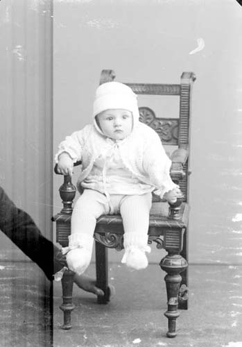 Ett spädbarn, en pojk, med mössa på huvudet sitter i en liten stol. En arm från vänster håller ett stolsben.