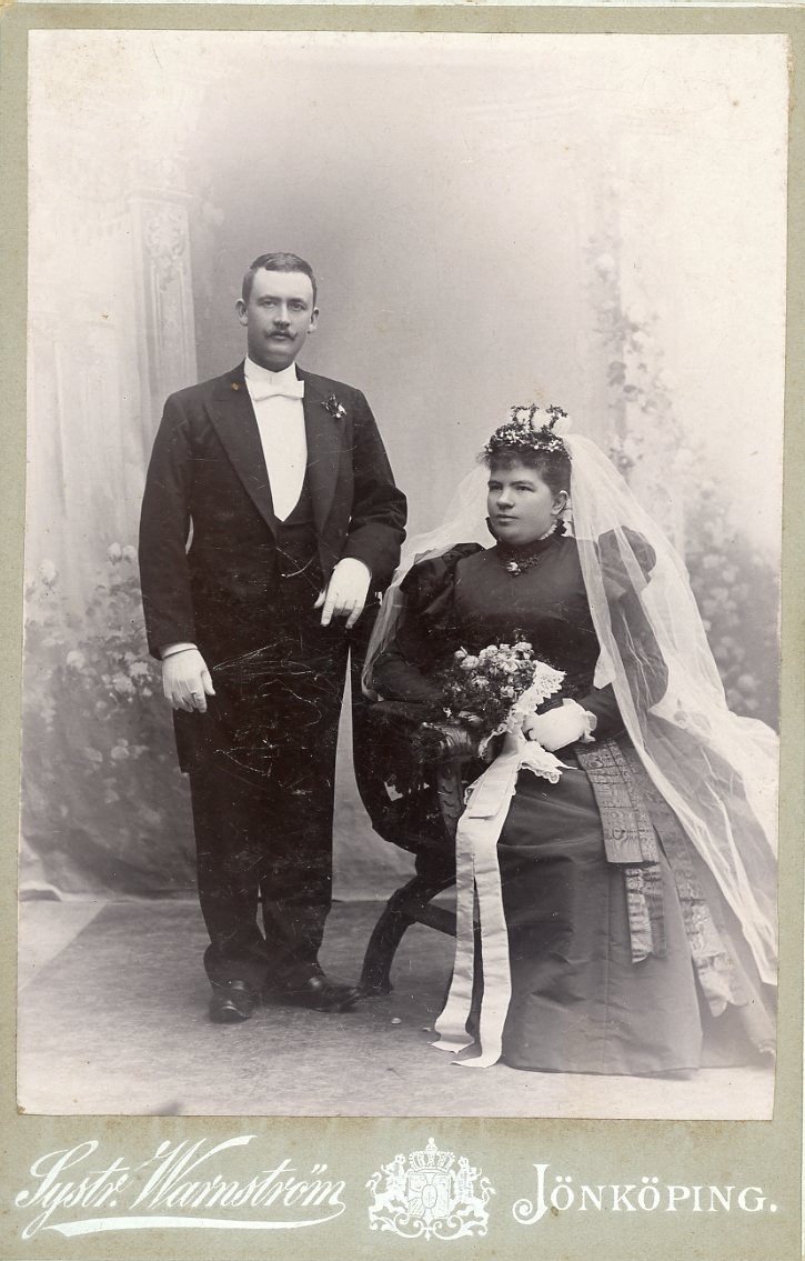 Kabinettsfotografi av ett brudpar. Bruden i mörk klänning sitter på en stol med blomsterbukett i händerna.