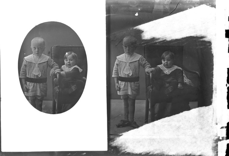 Porträtt av två små barn, vara den minsta sitter i en stol. Två bilder på samma glasplåt.