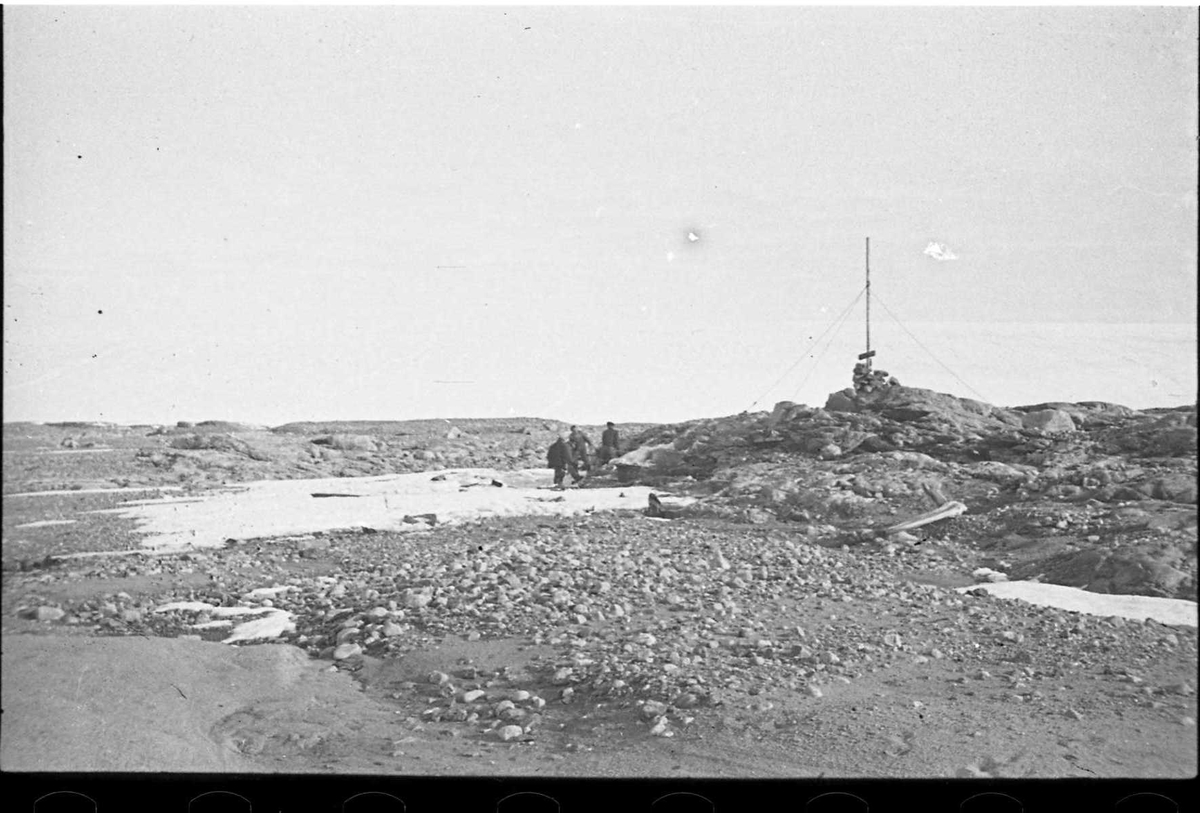Besättningsmän från Isbjörn i arbete med utgrävning av Andréeläget på Vitön. Till höger Horns varde som markerade platsen för fyndet.