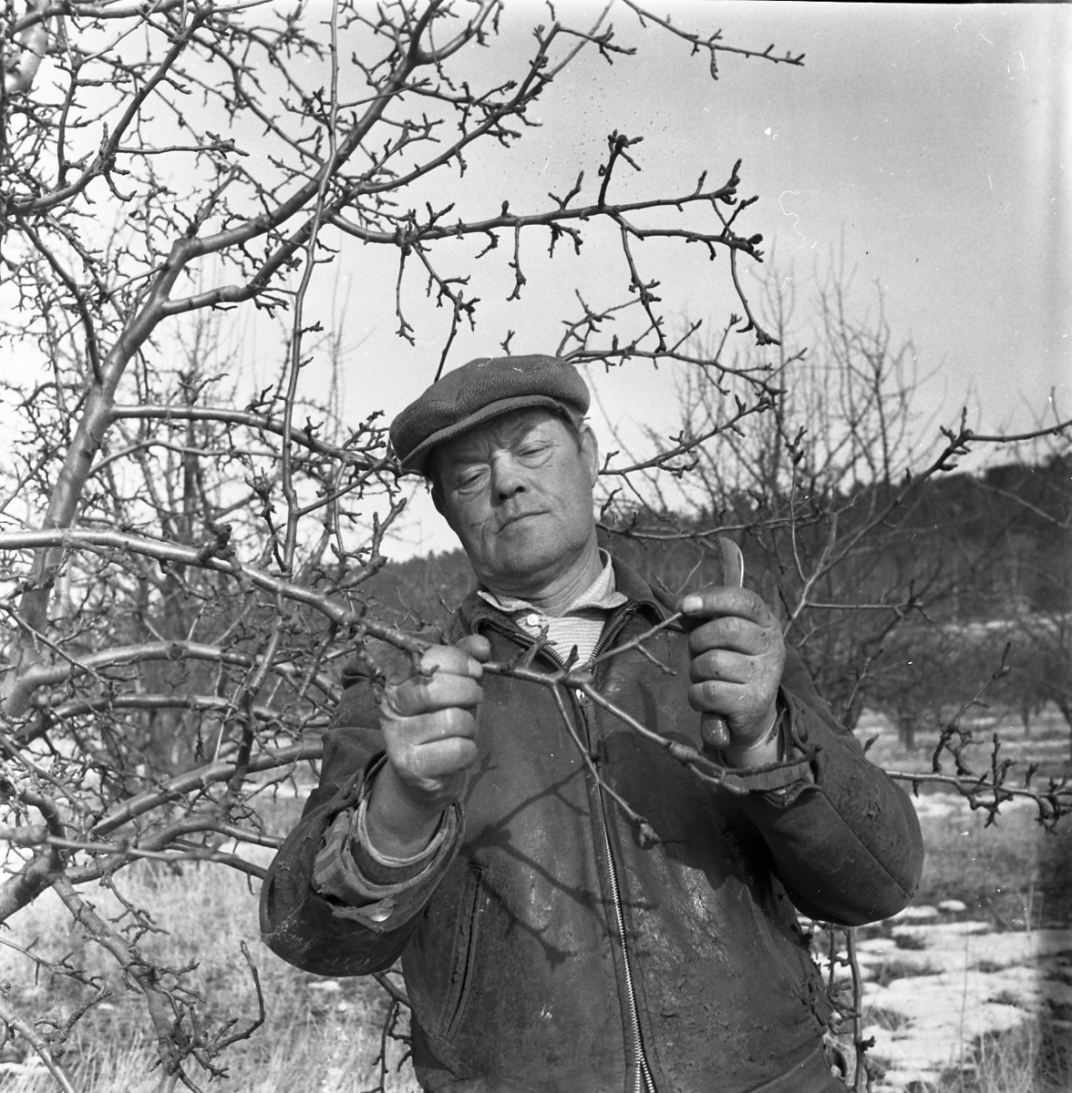 En kepsbeklädd man står under ett träd. Han ser in i kameran. Han håller i en gren och har en kniv i handen.