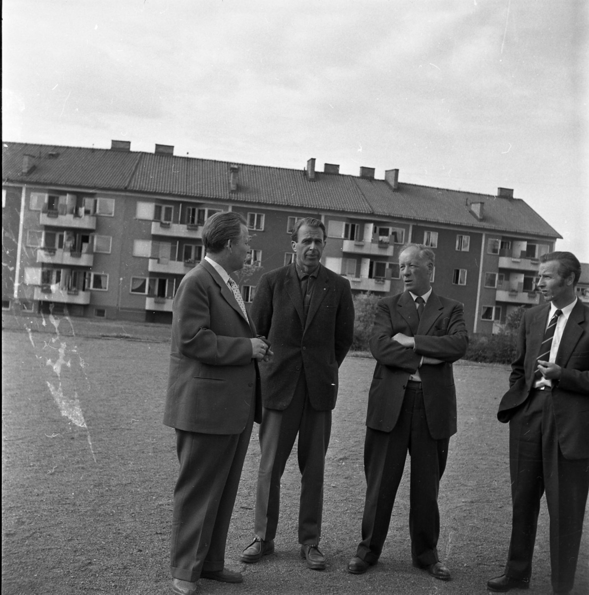 Fyra herrar står och pratar med varandra. Som nummer två från vänster står Carl-Wilhelm Lothigius och som nummer tre står rektor Erland Skog. I bakgrunden syns ett lägenhetskomplex.