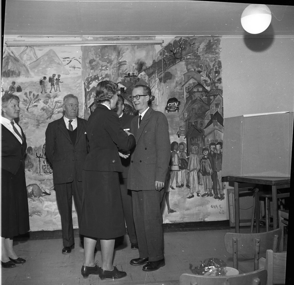 En man och en kvinna skakar hand. Bakom dem står fler damer och herrar och tittar på. På väggen bakom dem hänger ett konstverk. Motivet på konstvärket är en bilväg med människor i förgrunden.