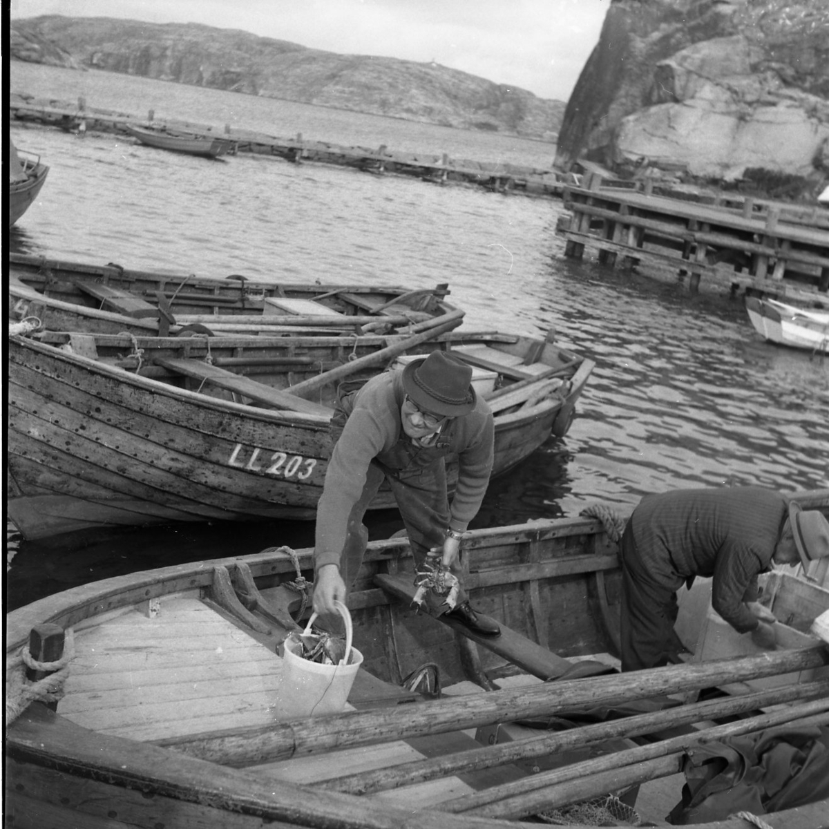 Två män i en eka vid en brygga. Flera ekar ligger förtöjda intill.
