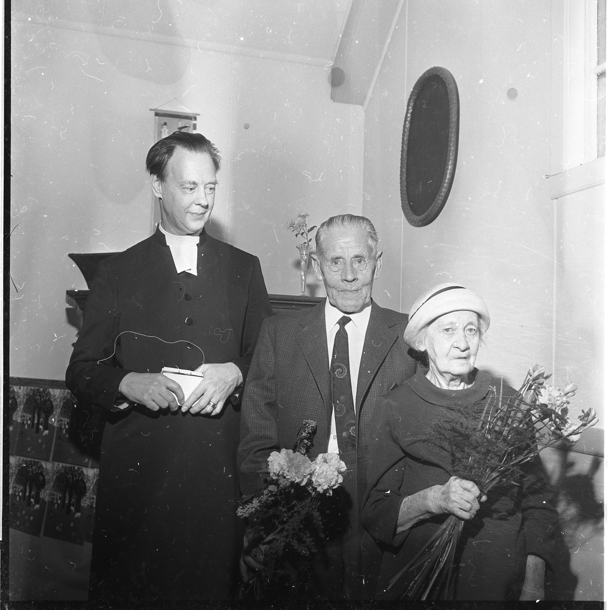 En präst står bredvid en äldre man och kvinna, de båda senare har blomsterbukett i händerna.