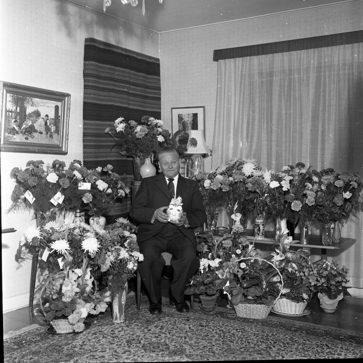 Titel: Gunnar Persson sitter i sitt hem omgiven av ett stort antal blomsterbuketter. Till vänster på väggen hänger tavlan "Grindslanten".