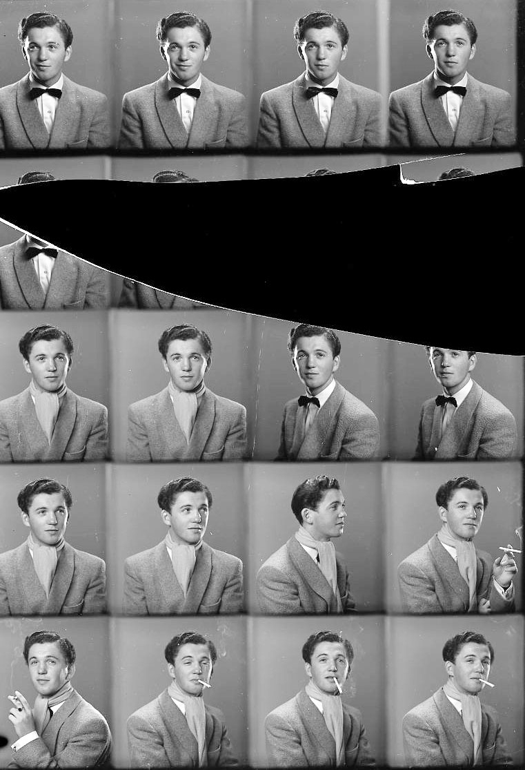 Bröstbild av en ung man med fluga och kavaj, med halsduk respektive rökande el med cigarett i handen.