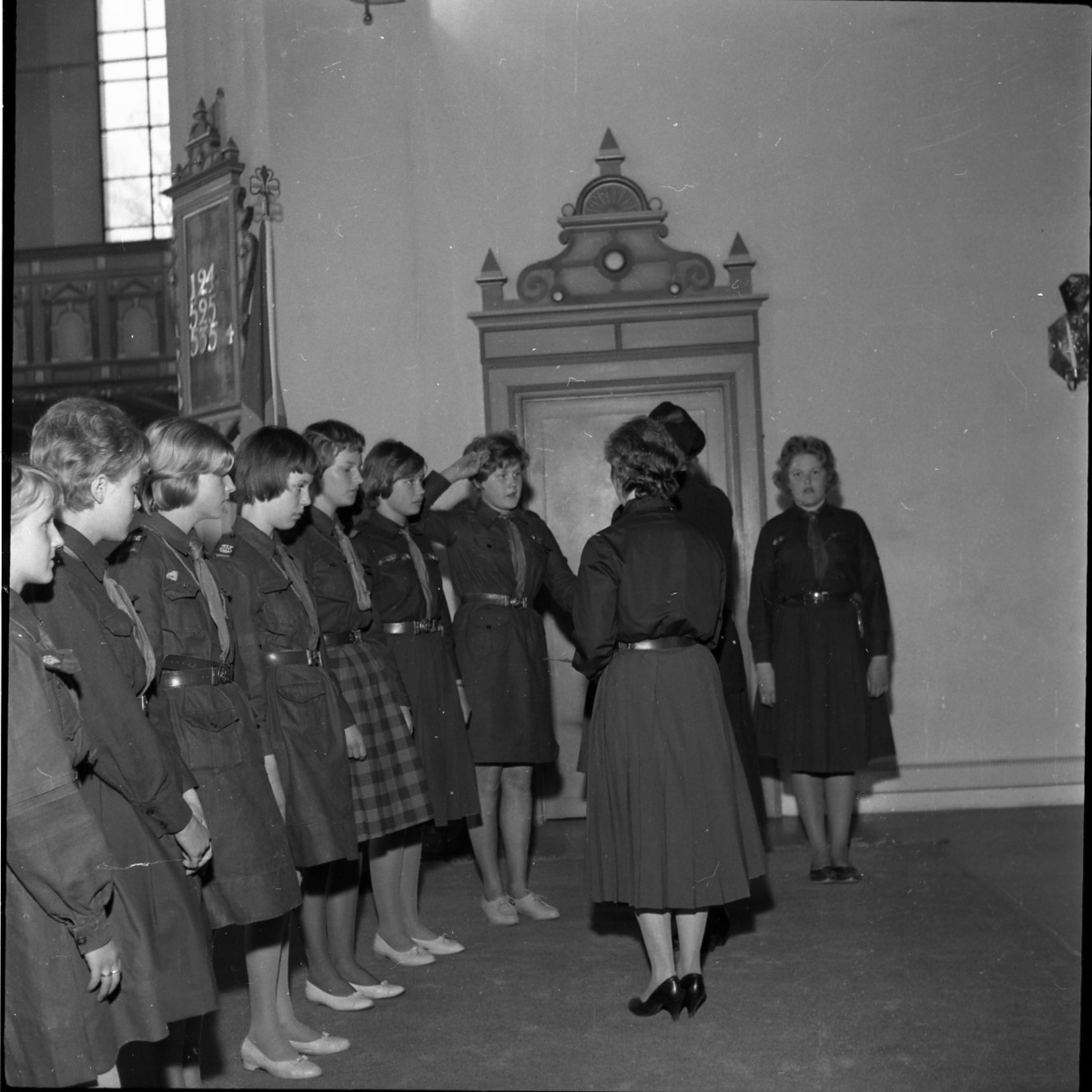 Några unga flickor står uppradade framför en scoutledare. Scoutledaren går runt och skakar hand med flickorna som är iklädda scoutuniformer.
