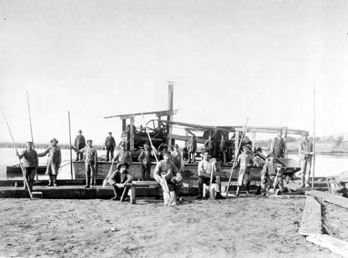 Ett 10-tal män i arbetskläder med skyfflar och skottkärror ett mudderverk i Gränna hamn.
